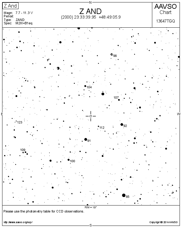 Geschichte: Im Dezember 1985 ereignete sich der erste Ausbruch nach mehr als 15 Jahren, der eine Helligkeit von mehr als neunter Größenklasse erreichte, nälich 8.6mag. Mit mehr oder weniger regelmäßigen Schwankungen bewegte sich der Stern im folgenden Jahrzehnt zwischen 10 und 11 mag, bevor im Sommer 1997 wieder ein Ausbruch auf etwa 9.7mag erfolgte. Im September 2000 kam es dann zu einem weiteren hellen Ausbruch auf maximal 8.7mag. Kurz nach dem Abstieg auf die Minimalhelligkeit von etwa 11mag zeigte Z And einen weiteren kurzen, etwa drei Monate dauernden, Ausbruch auf bis zu 9.8mag. Im August 2004, im Sommer 2006 und im Jahr 2008 erreichte der Stern jeweils 8.5 bis 9.5 mag, bevor dann ab September 2009 der Anstieg in den bisher hellsten Ausbruch begann. Der Abstieg führte auch nicht mehr weit nach unten, sondern nur auf knapp 10 mag im Jahr 2010, bevor es Ende 2011 zu einem weiteren Maximum bei 9.2 mag kam.