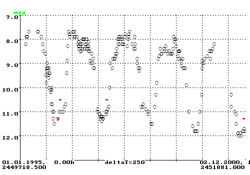 Eine Doppelperiode ist daher möglich, mit größerer Sicherheit aber erst unter Berücksichtigung einer weitaus größeren Zahl von Beobachtungen zu entdecken. Der dafür notwendige Zeitraum beträgt wohl noch einmal 50 bis 100 Jahre! Einen ersten Eindruck können die nächsten fünf bis zehn Zyklen geben, in denen die Maximalhelligkeit den Bereich von 8.0 bis 8.5mag verlassen und wieder auf Werte von 7.0 bis 7.5mag wandern sollte.