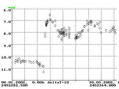 Wenige Tage nach Entdeckung des Ausbruchs auf 9.0mag, also während der Veröffentlichung des letzten Rundbriefes, fiel die Helligkeit bereits wieder auf 10.3mag und anschließend mit langsamer Rate weiter bis auf 11.0mag am 1.Februar. Zwar ließ sich bis zu diesem Tag keine eindeutige Typenbeschreibung abgeben, aber die Lichtkurve selbst verlief unspektakulär und eigentlich wie eine Nova mit langsamem Helligkeitsabfall.