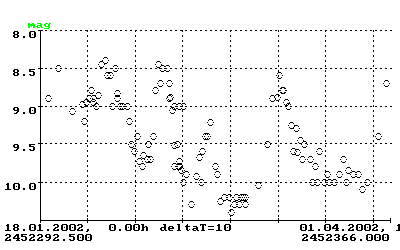 Der Helligkeitsverlauf (Abb. 3) führte bisher über vier Maxima von 8.4, 8.5, 8.8mag und 8.8mag am 1. und 13.Februar sowie am 9. und 31.März. Aufgrund der ungünstigen Lage am Morgenhimmel gab es durch BAV Mitglieder nur dreizehn Beobachtungen: Enskonatus (2), Kriebel (6) und Vohla (5).