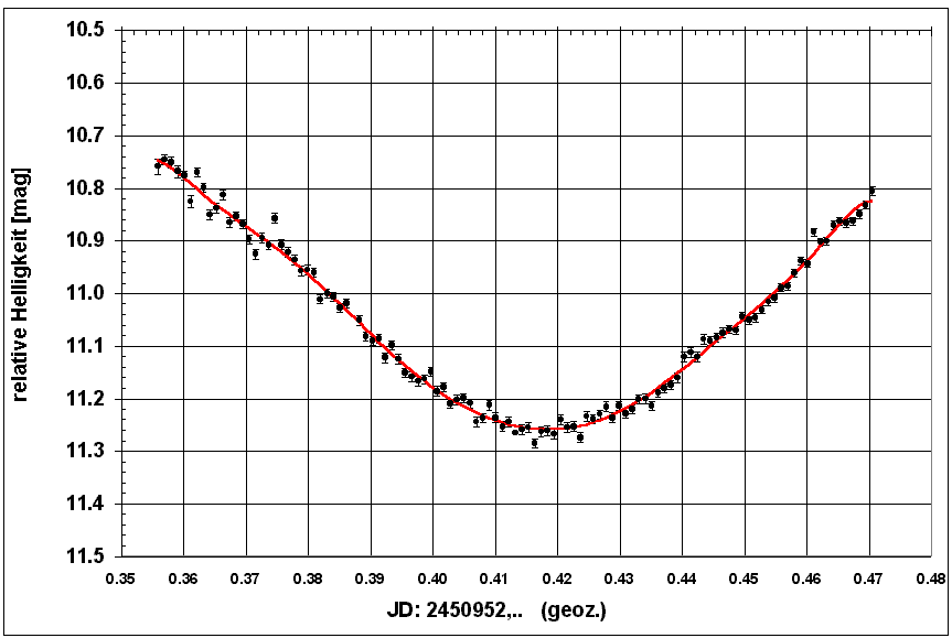 Vor einiger Zeit fiel W. Braune ein Widerspruch zwischen der CCD-Beobachtung vom 18./19. Mai 1998 (D. Husar) und dem BAV Circular auf. Dort ist eine konstante Phase "d" im Minimum von 0,6 Stunden (ent-sprechend 0.025 Tage) Dauer eingetragen. Die Lichtkurve (Abb. rechts) lässt davon jedoch nichts ahnen. Bestenfalls 10 Minuten Konstanz im Minimum wären aufgrund der Streuung der Messpunkte denkbar. Das Beispiel zeigt wieder den Nutzen von Lichtkurven für die Kommunikation in der BAV. Es erinnert aber auch jeden Beobachter daran, seine Ergebnisse aufmerksam mit früheren Veröffentlichungen zu vergleichen. Hat sich nun das System UZ Lyr verändert? Woher stammt die Eintragung im BAV Circular? Zunächst ergibt das Nachsehen im Anhang des GCVS4 [1], dass dort das "d" mit einem Unsicherheitsvermerk versehen ist. Weiter findet sich aber auch ein Hinweis, der wohl von Nijland [2] stammt, auf eine variable Periode, was auch auf mögliche Veränderungen in der Lichtkurve deuten könnte. Nach Literaturrecherchen in SIMBAD und zur Lichtenknecker-Datenbank ist Werner Braune diesen Fragen in der Literatur nachgegangen. In der GuL [3] von 1936 fand er schließlich den folgenden Hinweis, der auf Leiner [4] abstellt: "...eine Konstanz im Minimum ist nicht nachgewiesen, doch lassen die Beobachtungen die Möglichkeit einer Konstanz von höchstens 0.4 [h] offen." Diese GuL-Angabe könnte als Ursache für die späteren Eintragungen in Frage kommen. In [4] steht hierzu nichts. Aber auch sonst finden sich in der GuL noch weitere interessante Anmerkungen: "An der Lichtkurve scheint bemerkenswert, daß die Minima nicht immer die selbe Tiefe erreichen, ohne daß darin eine bestimmte Gesetzmäßigkeit zu erkennen ist." Das war visuell, dennoch sind weitere genaue Beobachtungen des Sterns auch in dieser Hinsicht interessant.