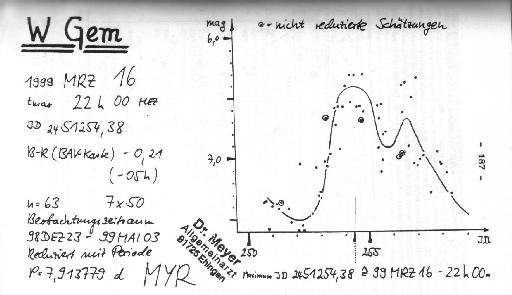 Die Helligkeit von W Gem schwankt zwischen 6.m54 und 7.m38. Diese Schwankungen sind mit einem Feldstecher 7x50 gut zu beobachten. Die Lichtkurve ist asymmetrisch mit einem raschen Anstieg und einem langsameren Abfall. Den Katalogen (GCVS 1987) entnehme ich folgende Lichtwechsel-Elemente