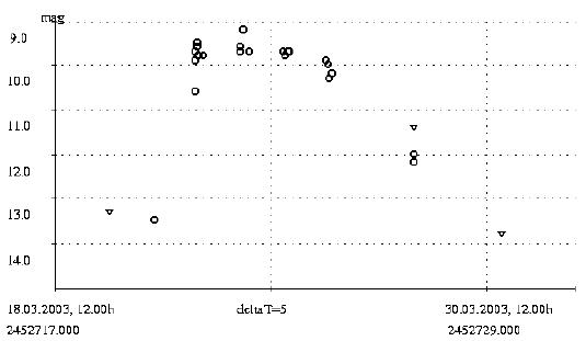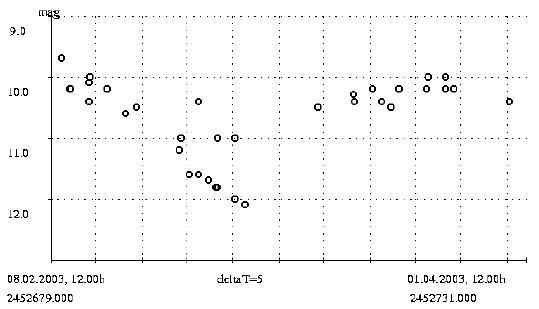 Im vorletzten Rundbrief [3] berichtete ich von einem seltenen Helligkeitsanstieg dieses symbiotischen Sterns. Die Helligkeit blieb von Mitte August 2002 bis Anfang Februar 2003 ungefähr konstant bei 9.6 mag und fällt seitdem langsam ab.